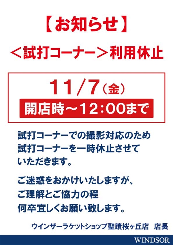 【ご案内】< 試打コーナー利用中止のお知らせ>11/7(金)開店時~12:00
