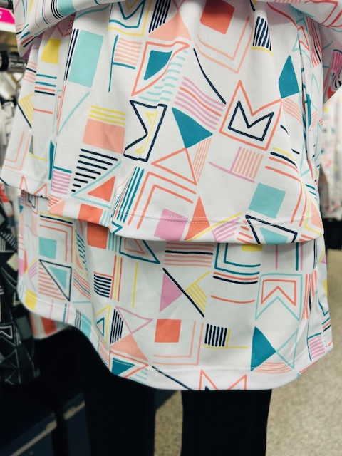 本日発売、テニスシューズ、ビーナスマッシュにもプリントされている、ポップなビーチハット柄。スコートの後ろ部分は、二重になっていて、ふわっと揺れるシルエットに!