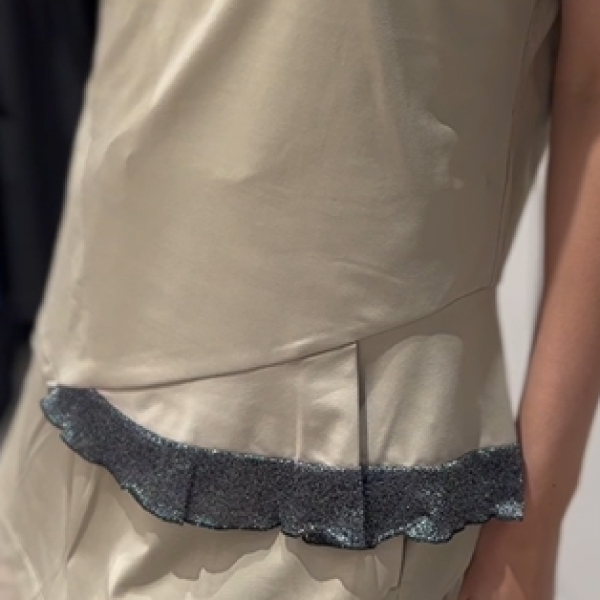 アシンメトリーな裾切替に、メロー始末のラメニットを施したTシャツ。前裾はタックデザインでボリューム感を演出。 吸水速乾とUVカットの機能を持ちながら抜群の伸縮性でしなやかな着心地を実現する定番のストレッチ天竺素材を使用。