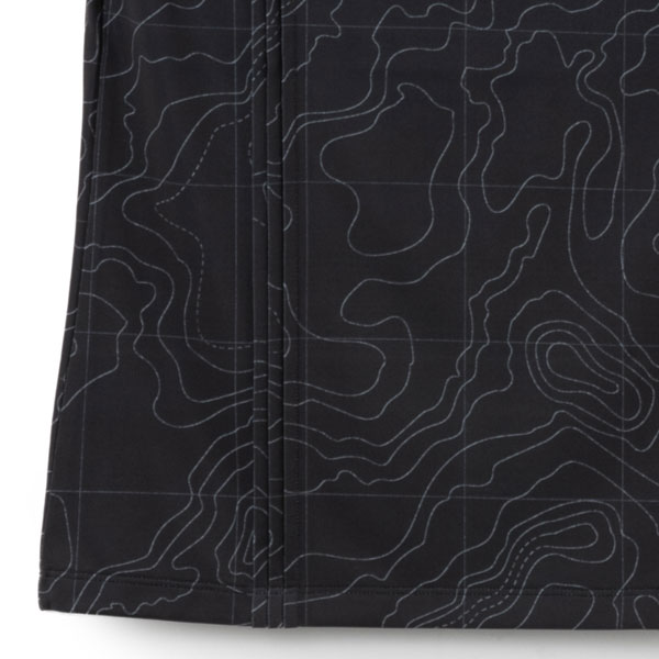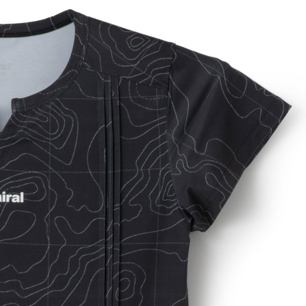 - ピンタックとノッチラインの衿デザインがすっきりとした印象の総柄Tシャツ。