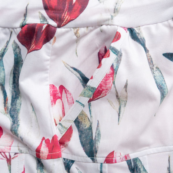 しなやかな着心地を実現する定番のストレッチ天竺素材を使用。両脇ポケット、ウエスト紐調整有り。