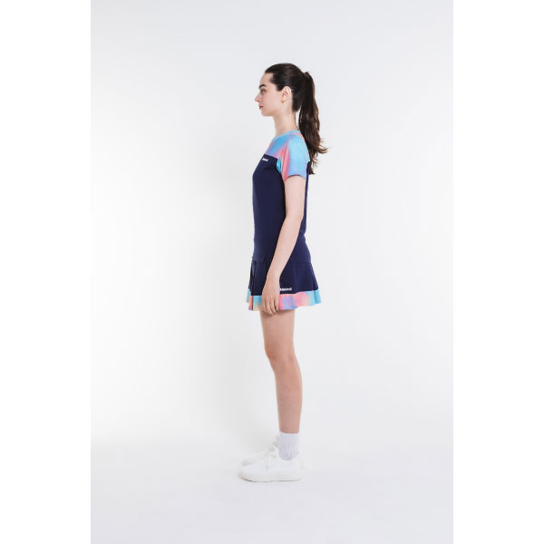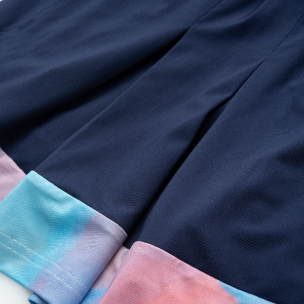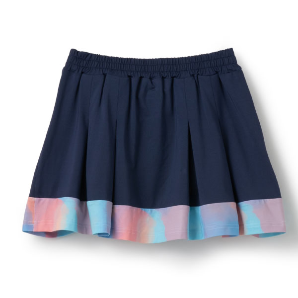 - 裾にグラフィック切替を施し、大きめのタックプリーツで動きを華やかに演出するスコート。