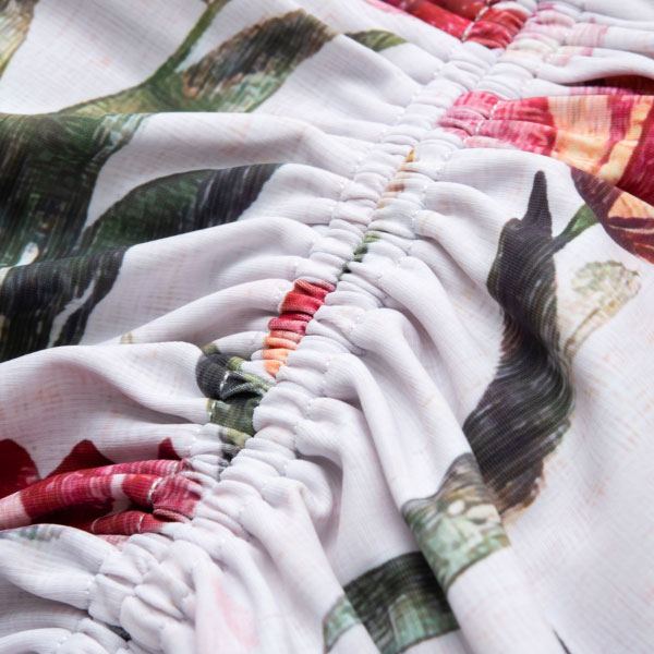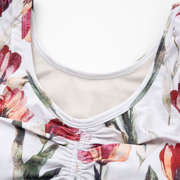 前中心と肩のシャーリングギャザーが存在感を演出。内側メッシュ裏地&取り外し可能カップスリットポケット仕様。