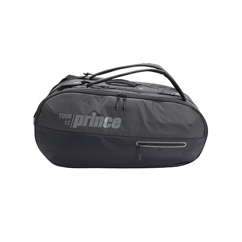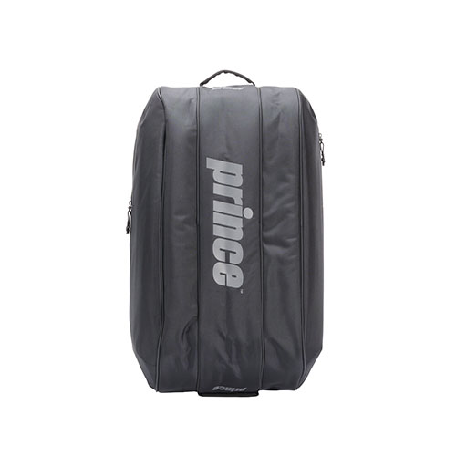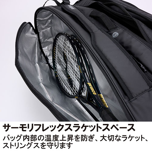 - PUコーティングされた生地とシルエットが特徴のprinceグローバルデザインの12本入ラケットバッグ。長さ76×幅33×高さ37cm