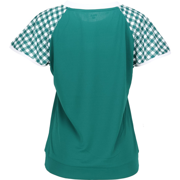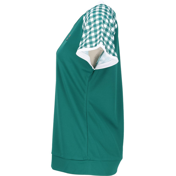 - 無地部分のボディが汗染み防止素材です。袖のフレアーに対してボディが無地なので引き締まった印象のシャツです。ぜひ同柄のスコートとコーディネートしてください。