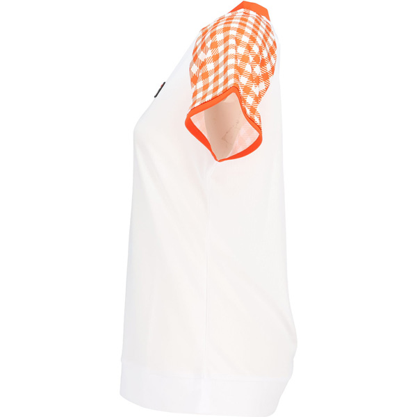 - 無地部分のボディが汗染み防止素材です。袖のフレアーに対してボディが無地なので引き締まった印象のシャツです。ぜひ同柄のスコートとコーディネートしてください。