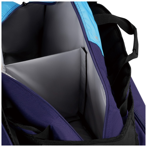 センターポケットに折りたたみ式の仕切り(1枚)を設け、衣類やシューズなどの分別収納が可能。仕切板をたためば、ラケットを収納できます