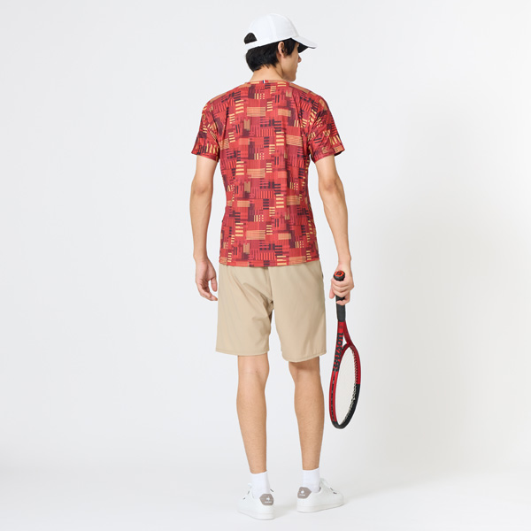 - 特徴・デザインポイント"Aileforme"パターンを特徴としており、ギアとしてのアパレルを目指したアイテム。テニスをされる方の優雅な動きに寄り添うことができるしなやかでコンフォートなテニスウェア。テニスの基本動作である、サーブ・ストローク・ボレーの動きに着目し、DISCで検証し開発したウェア。動作時のストレスをダーツとパターンで解消した"Aileforme"パターンを搭載したゲームシャツ。全面にビーチチェアをモチーフにしたデザインを採用。4大臭(アンモニア、酢酸、イソ吉草酸、ノネナール)を全て70%以上カット出来る消臭テープを付与することで、匂いを気にせず着用可能に。JTA(日本テニス協会)の定めるウェア規定を満たしたテニスウェア。素材着心地柔らかく、ストレッチ性に優れたベア天竺素材を採用することでテニスの動きをスムーズにシルエットレギュラー