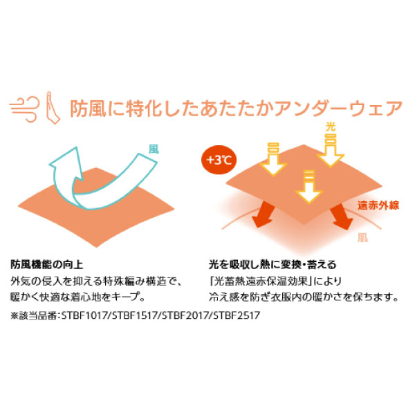 - 美容や健康のため、スポーツを愛するユーザーへ。防風に特化したあたたかアンダーウエアです。外気の侵入を抑える特殊編み構造で、あたたかく快適な着心地をキープ。「光蓄熱遠赤保温効果」により、冷え感を防ぎ衣服内の暖かさを保ちます。圧迫感のない適度な着圧が筋振動を抑え、快適な着心地で身体を優しくサポートします。