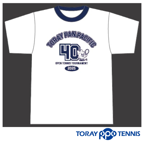 商品説明 | 大会40回記念を祝したスペシャルデザインTシャツが登場! センターには「40」の大きなナンバリングと、東レPPOテニスの公式キャラクターをあしらい、記念グッズならではのインパクトと親しみやすさを両立。 首元のネイビーリブがアクセントとなった、ユニセックスで着やすい1枚です。 |