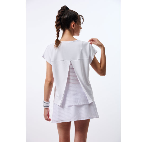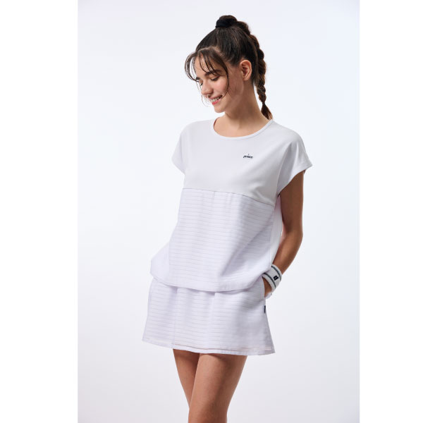 メーカー プリンス 品番 WS6074-146 カラー ホワイト(146) サイズ S/M/L/LL 対象性別 レディース 素材 ヒートプルーフピンメッシュ、ボーダーレース 素材 機能 吸汗速乾/UPF50+/接触冷感/遮熱 発売日 2026年3月