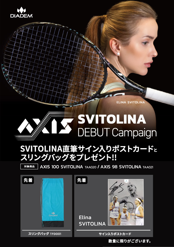 内容 上記期間中にダイアデムの硬式ラケット「AXIS SVITOVINAモデル」をご購入いただくと、エリナ・スビトリナ選手直筆サイン入りポストカードとDIADEMスリングバッグをプレゼント!
