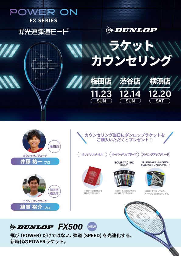 | タイトル | 【梅田店・渋谷店・横浜店開催】 ダンロップ ラケットカウンセリング |