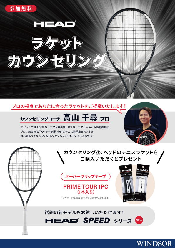 | 内容 | HEADの最新機種を含む全ての機種をお試しいただくことが出来ます。また、当日は高山千尋プロをお呼びしてお客様のラケット選びをお手伝いさせていただきます。 そして、カウンセリング当日にご予約・ご購入いただいたお客様には特典もご用意しております! |